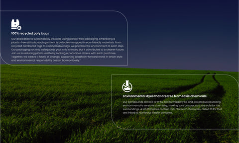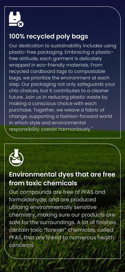 Our sourcing and manufacturing processes are designed to minimize waste and recycle resources. We use recycled polyester in our fabrics and recycled packaging materials to reduce waste and impact on environment.